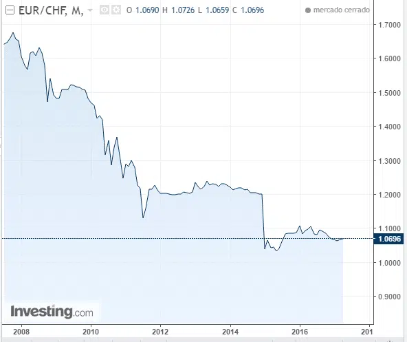 En nuestro ejemplo, 150.000 EUR a finales de abril de 2008 valían 243.000 CHF. O dicho de otra forma, con 1 EUR podíamos comprar 1,62 CHF.