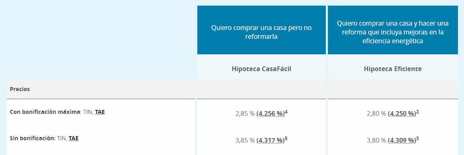 En la página principal dedicada a las hipotecas nos informan de las condiciones generales ofrecidas. Distinguen entre la Hipoteca CasaFácil (compra sin reforma) y la Hipoteca Eficiente (compra con reforma para mejora de la eficiencia energética):