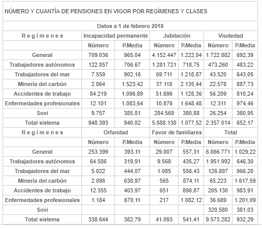 En la tabla anterior tenemos las pensiones contributivas: incapacidad permanente, jubilación, viudedad, orfandad y pensiones a favor de familiares, que suman un total de 9.573.282 pensionistas a febrero de 2018.