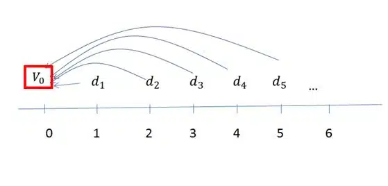 Si consideramos los ingresos netos del alquiler (d, d2…) y tomamos el tipo de interés (real, descontada la inflación) que consideremos aplicable en cada periodo (r1, r2…), actualizando el flujo de caja tendríamos Vo, el valor actual del alquiler. Comparando este valor con el precio de venta, podríamos decidir si vendemos o alquilamos.